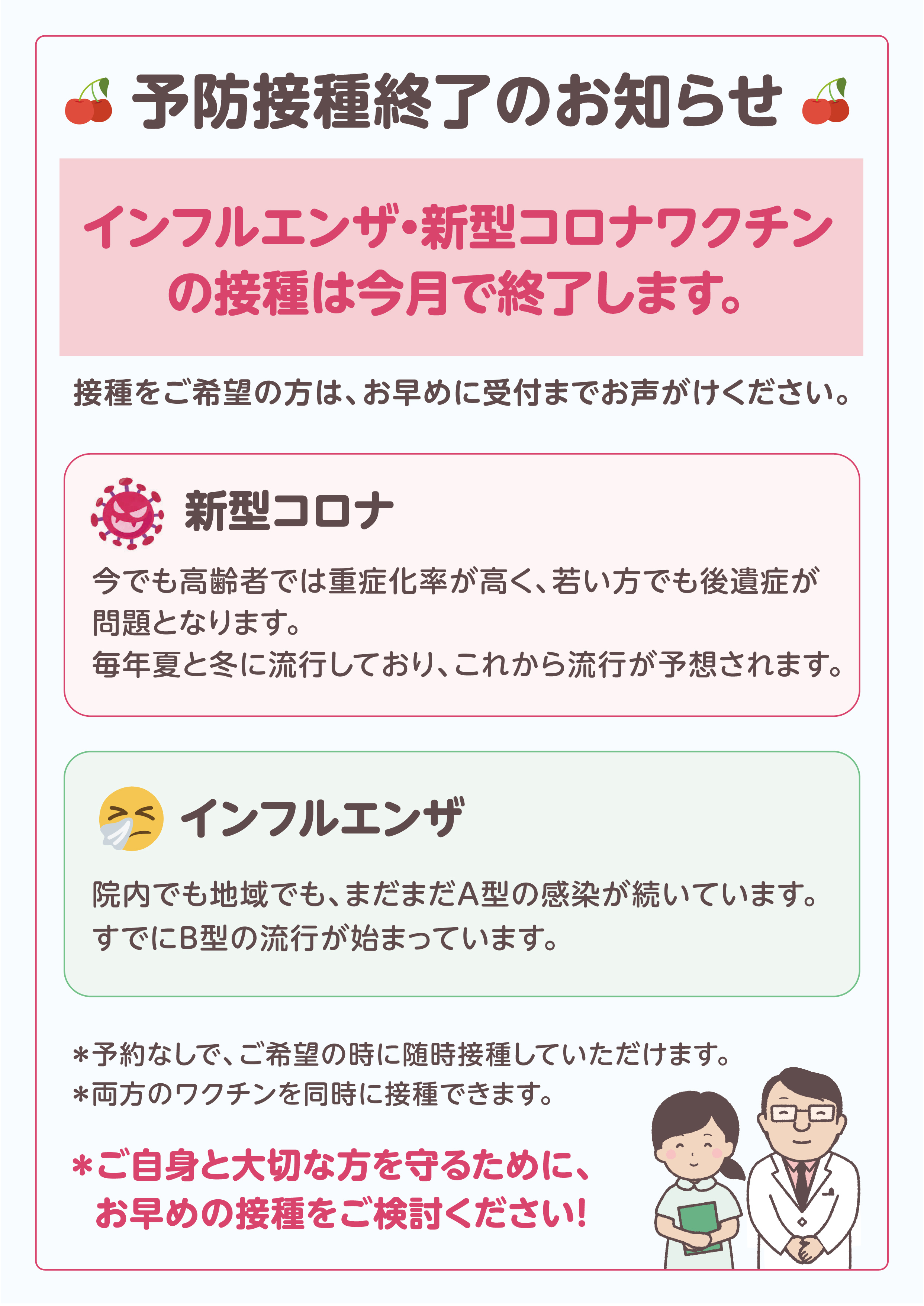インフルエンザ・新型コロナワクチンの接種は今月で終了します。