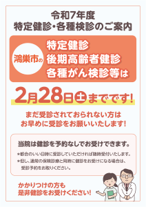 鴻巣市の特定健診・後期高齢者健診・各種がん検診等は2月28日(土)までです!